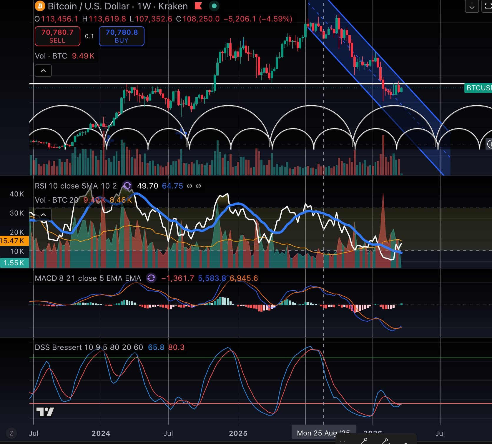 On the weekly chart, Bitcoin remains inside a clear downward channel.